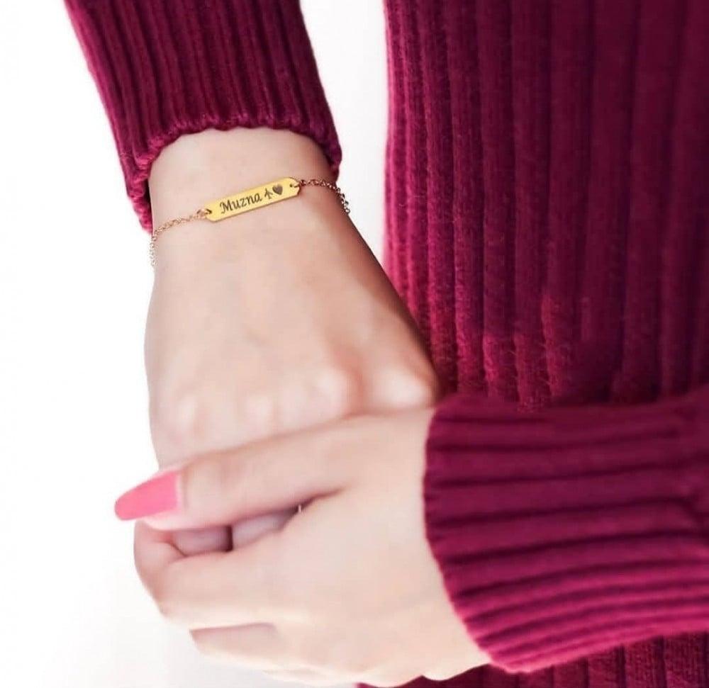 اسوار يد مع اسم بتصميم القلبموصفات المنتج:مطلي بالذهب عيار 21 قيراط.يمكنك تخصيص أي اسم أو كلمة (عربي أو إنجليزي).سهلة التحكم بالمقاس.متوفر طلاء ذهبي أو فضي (روديوم).ضمان سنتين على اللون من متجر امياس